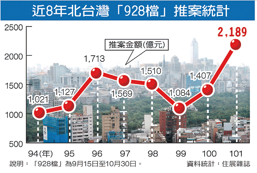 從本周六(9月15日)起至10月30日為止的928檔期,是房市傳統3大檔期,也是年度最后一個檔期。根據住展雜志統計,今年928檔北臺灣案量在10億元以上指標建案,共54個,其中新北市20個最多,桃園14個、新竹11個,北市則有9個指標建案。總計北臺灣今年928檔共有2189億元案量,較去年的1407億元,大增782億元、增幅達55.5%,是自2005年以來,928檔最大推案量。