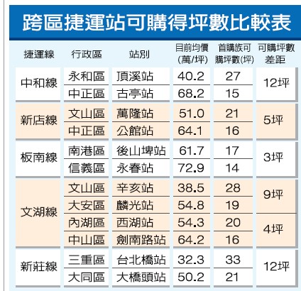 好房網(wǎng)表示,調(diào)查顯示,「跨區(qū)又跨市」的捷運站,價差最明顯,首購族也最能增加購得坪數(shù),除古亭、頂溪站外,新莊線的「臺北橋站」和「大橋頭站」,可購得坪數(shù)也同樣有12坪??的差距,在北市