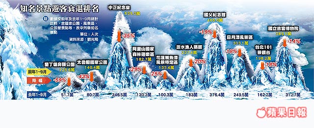 墾丁觀光客4年前800萬(wàn)人次,去年腰斬慘跌至400萬(wàn)人次,據(jù)觀光局最新統(tǒng)計(jì),去年1至9月與前年同期比較,國(guó)內(nèi)景點(diǎn)游客衰退前10名為墾丁貓鼻頭公園、太魯閣公園游客中心等,墾丁