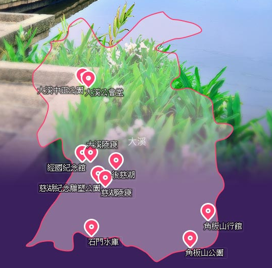 蔣中正領導人曾在第一次下野后來到大溪,眼見美景仿若他的故鄉奉化,因此便親自督工,興建了洞口賓館(奉厝后改為慈湖陵寢)。為了紀念慈母王太夫人,更將埤尾更名為慈湖,并在角板山及大溪興建了兩處行館,而這是他在眾多行館中最喜歡的一處。大溪領導人鎮不僅有結合歷史人文、生態與創意的兩蔣文化園區,還有神秘的后慈湖、幽靜的角板山行館、古色古香的武德殿,這些都是各地旅人前來朝圣的必游之地。大溪古鎮成為一個古今交融的風華小鎮。