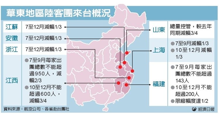 赴臺人數每年都成長的浙江、江蘇和安徽,則要求從7月起到12月,赴臺團客人數需減幅三分之一;上海暑期三個月要限縮三分之一,10 、11、12月減幅則達四分之一。