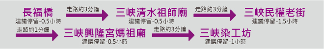 踏入三峽民權老街,好像進入時光隧道,復古、樸實的傳統式商業街屋建筑,時光像是停留在五十前年的臺灣。筆直的街道、整齊干凈,一幢幢的紅磚拱廊建筑、巴洛克式立面牌樓,訴說著昔日商業區街屋的繁華,無不令人眼睛為之一亮。街上不少懷舊古玩藝品店與小吃,假日的街道上,充滿尋古味的游人。