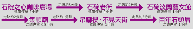 石碇老街是以石砌橋墩搭成的萬壽橋劃分東、西兩街。西街的集順廟廣場是昔日的茶市,東街上原味保留了昔日的不見天街、石頭厝…等,并座落百年歷史的王氏豆腐、福寶飲食店,是游客麋集漫步、大啖鄉土美食的所在。